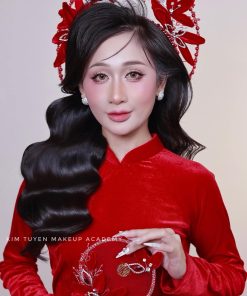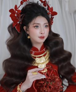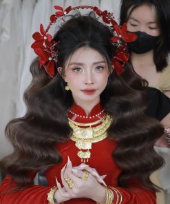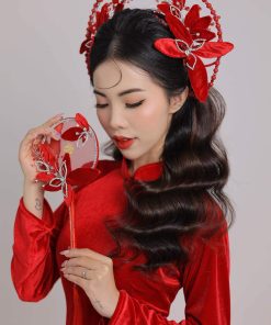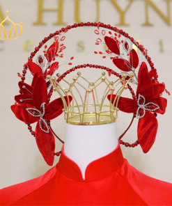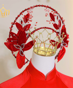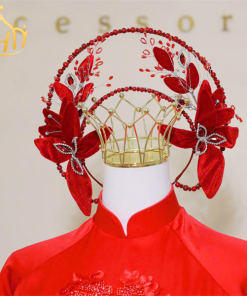 Mấn Khung Kim Loại Áo Dài Cô Dâu Màu Đỏ – Mấn Khung Viền Ngọc Trai Đính Hoa Nhung Mix Pha Lê Màu Đỏ Đô
