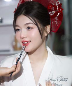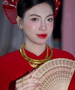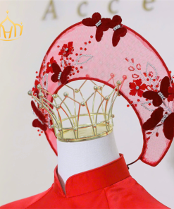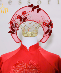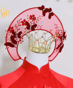 Mấn Khung Kim Loại Áo Dài Cô Dâu Màu Đỏ – Mấn Lưới Đính Hồ Điệp Mix Pha Lê Màu Đỏ Đô