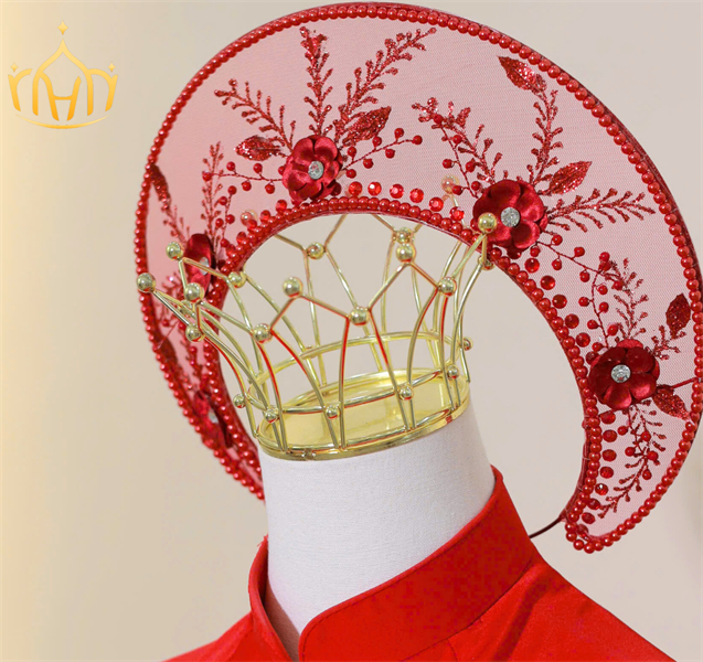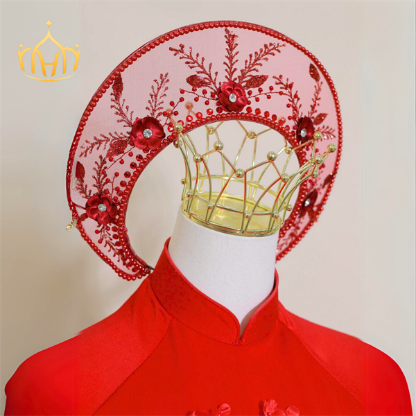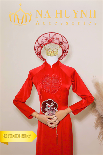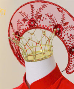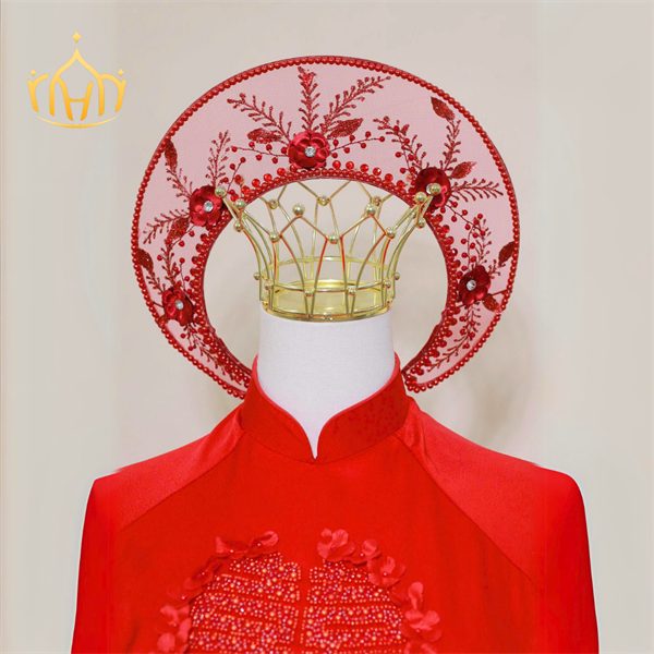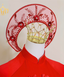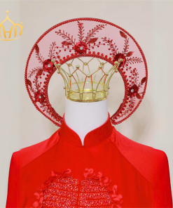 Mấn Khung Kim Loại Áo Dài Cô Dâu Màu Đỏ – Mấn Lưới Viền Ngọc Trai Đính Hoa Mai Màu Đỏ Đô