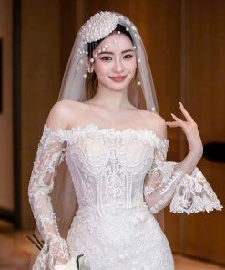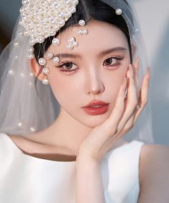 Mũ Ngọc Trai Tua Rua Đính Kèm Voan 1 Lớp 1m x 1m35