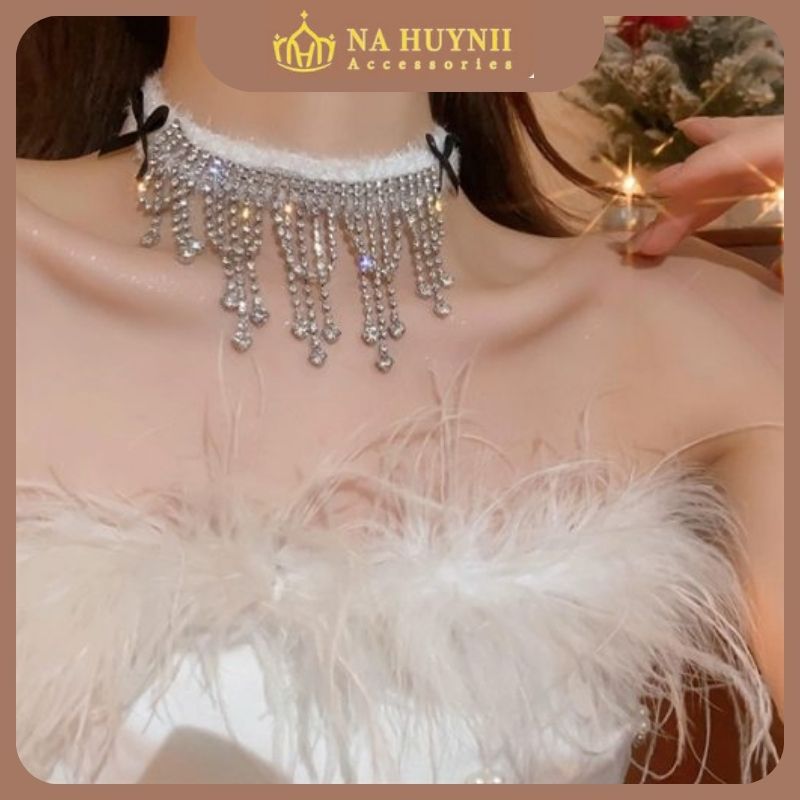 - Choker: Choker đang trở lại mạnh mẽ trong thời trang cưới. Loại vòng cổ ôm sát này đặc biệt phù hợp với váy cưới cổ thuyền hoặc cổ chữ V rộng. Choker tạo nên vẻ đẹp bí ẩn, cổ điển và rất thời thượng.