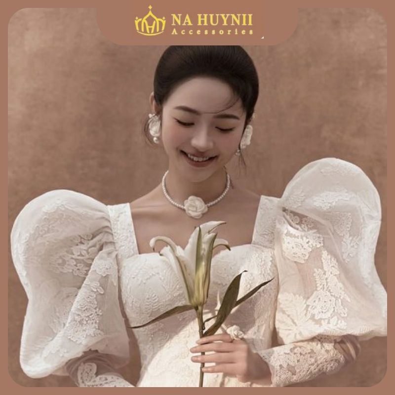 - Váy Cổ Cao (High Neckline): Tuyệt đối không nên đeo vòng cổ. Thay vào đó, hãy tập trung vào Bông tai dáng dài hoặc các món phụ kiện cô dâu cài tóc lấp lánh để làm nổi bật gương mặt.