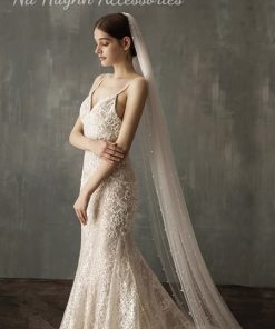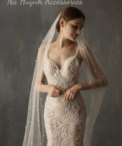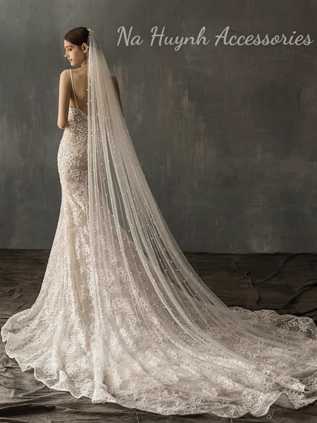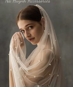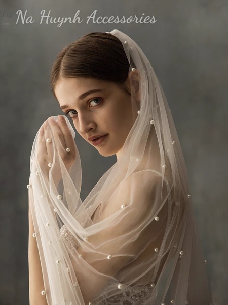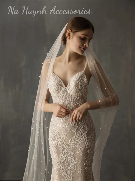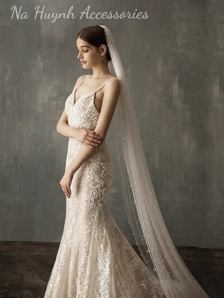 VOAN DÀI ĐÍNH HẠT TRAI 1 LỚP VOAN LÚP CÔ DÂU MÀU TRẮNG – 230CM Có Cài